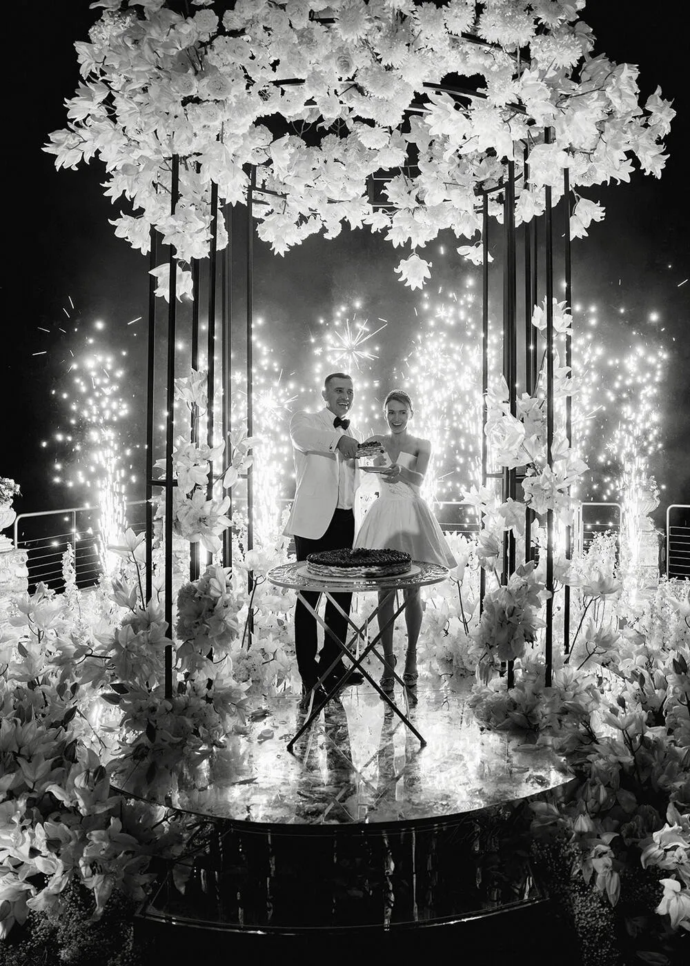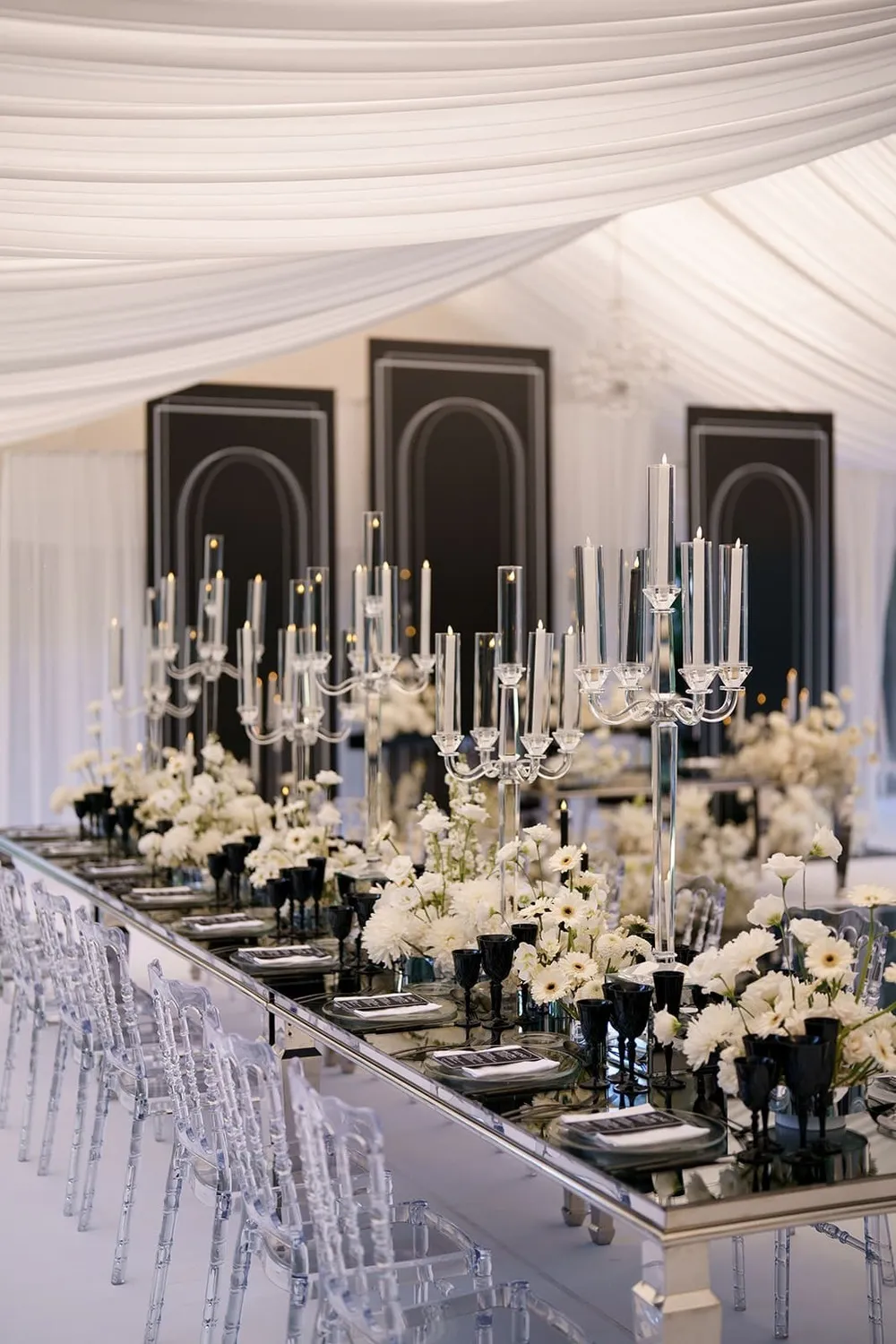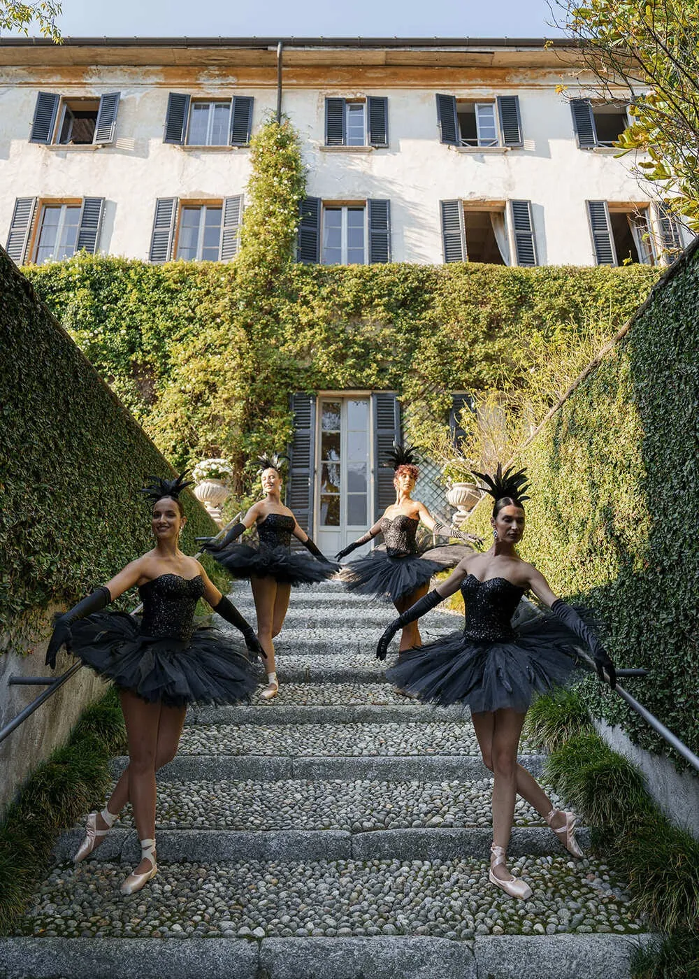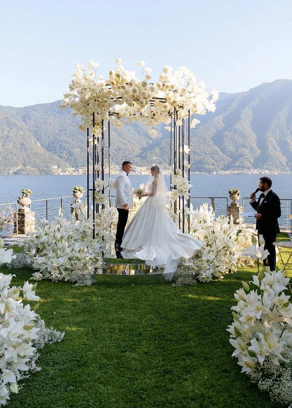 A stylish and minimalist black-and-white wedding with a strict dress code and sleek, contemporary design. Perfectly suited for a couple who loves a clean aesthetic and architectural decor, set against the backdrop of a luxury Italian venue.